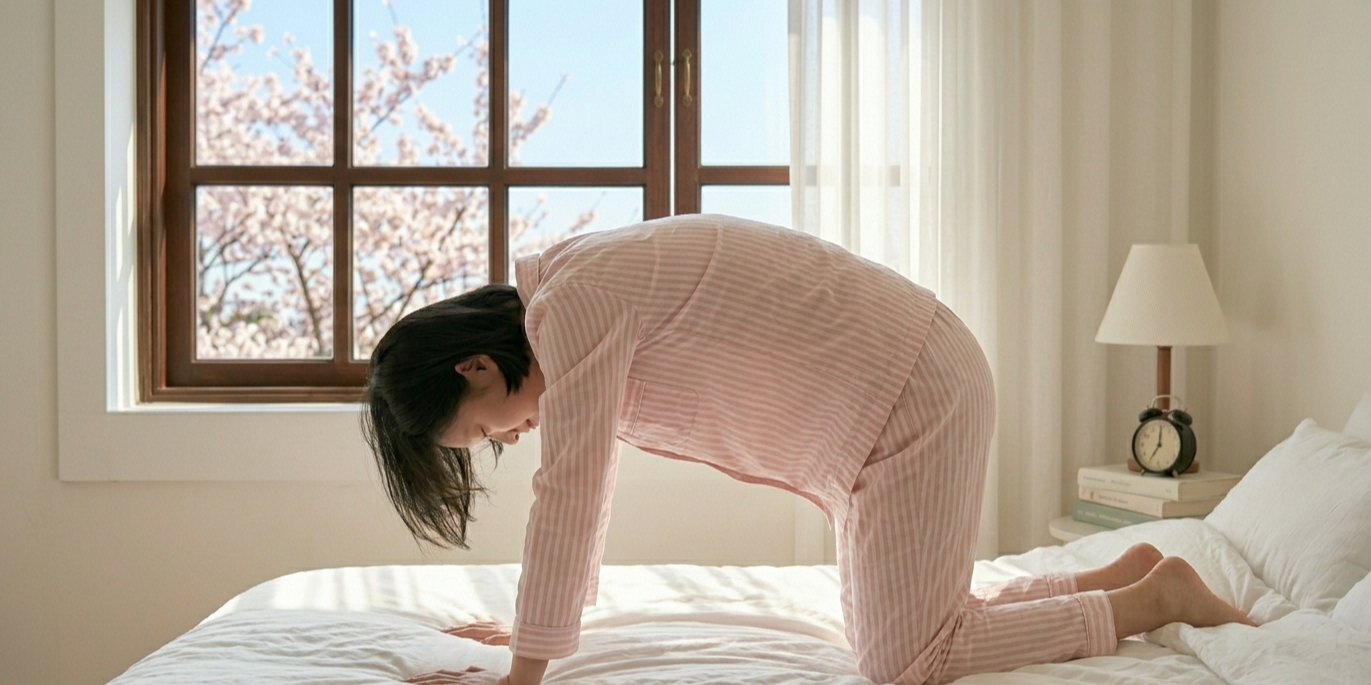 2. 고양이 자세: 침대에서 일어나 엎드린 채 등을 둥글게 말았다가 펴며 척추를 이완합니다.